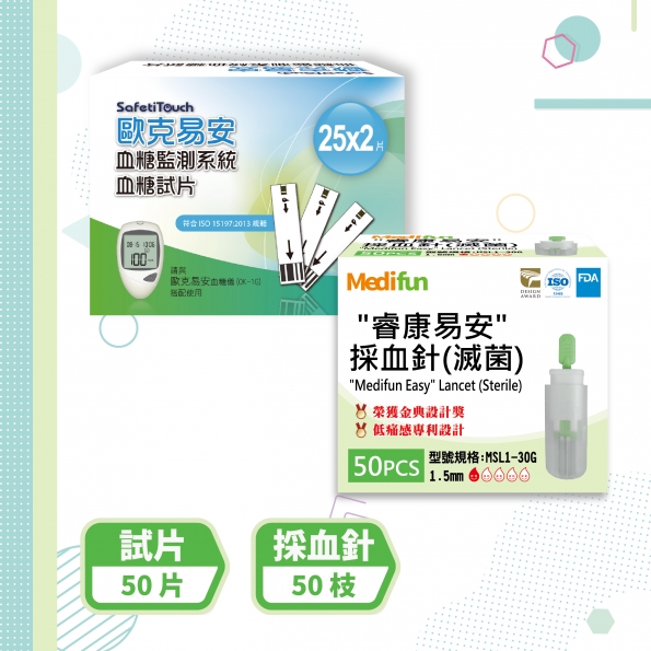 C4(26G)50片歐克易安試紙 1.歐克易安試紙(50支/盒) X 1 盒 2."睿康易安"採血針26G(50支/盒) X 1 盒 相當使用傳統採血筆,刻度5號以上。