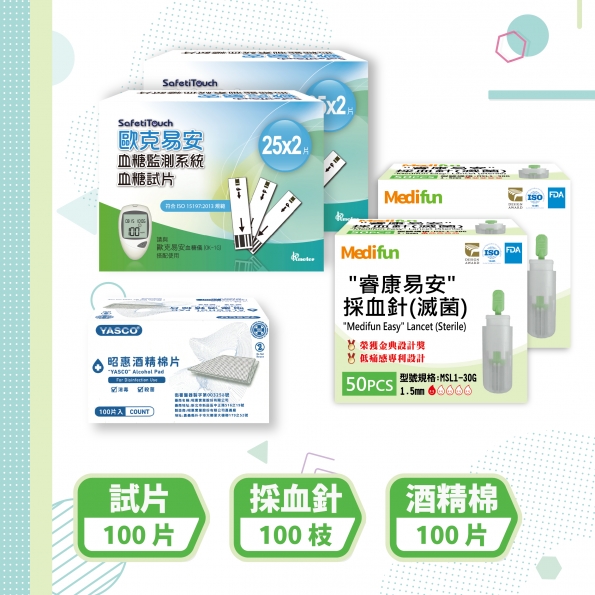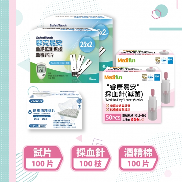 C3(26G)100片 歐克易安試紙 1.歐克易安試紙(50支/盒) X 2 盒 2."睿康易安"採血針26G(50支/盒) X 2 盒 相當使用傳統採血筆,刻度5號以上...